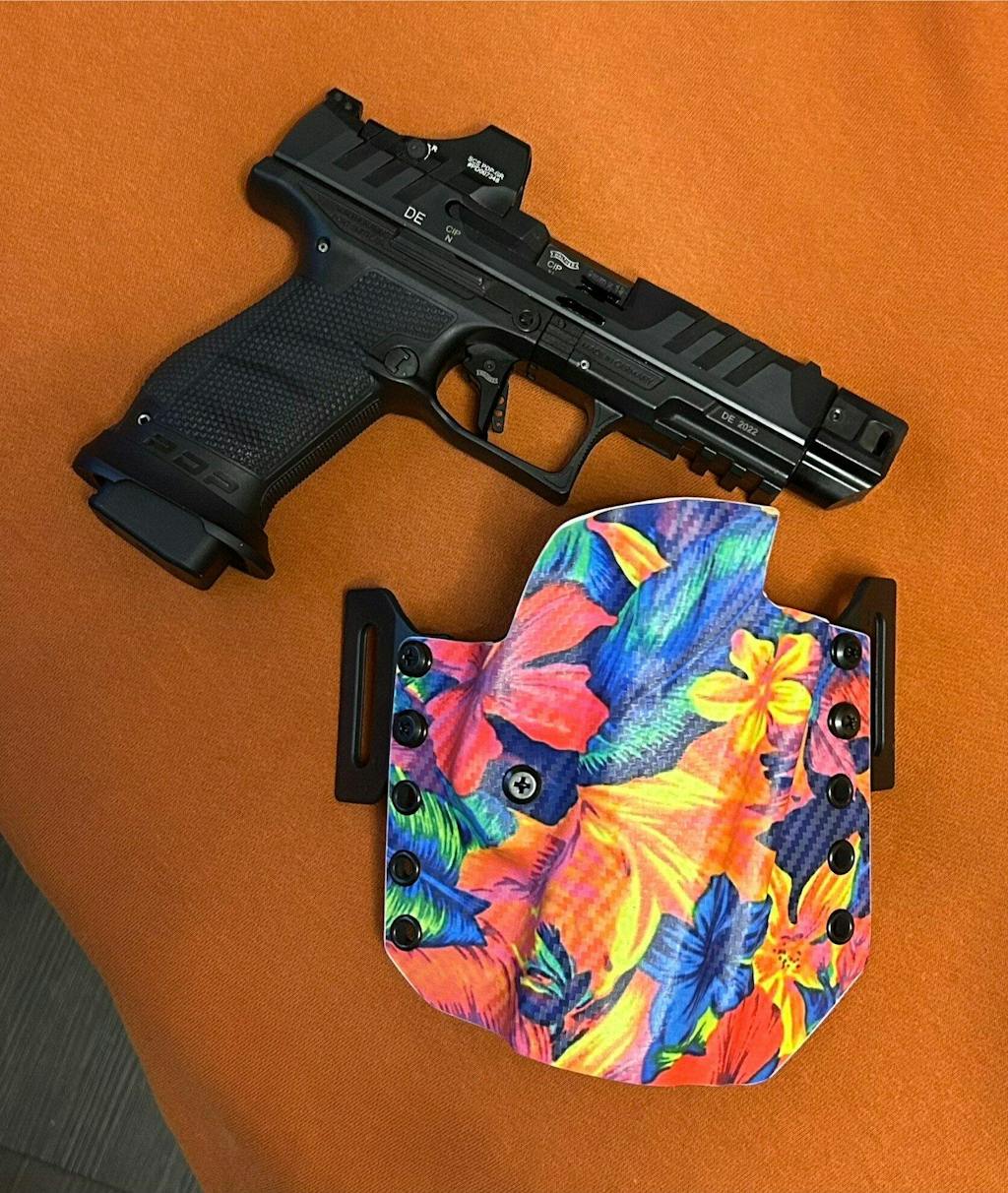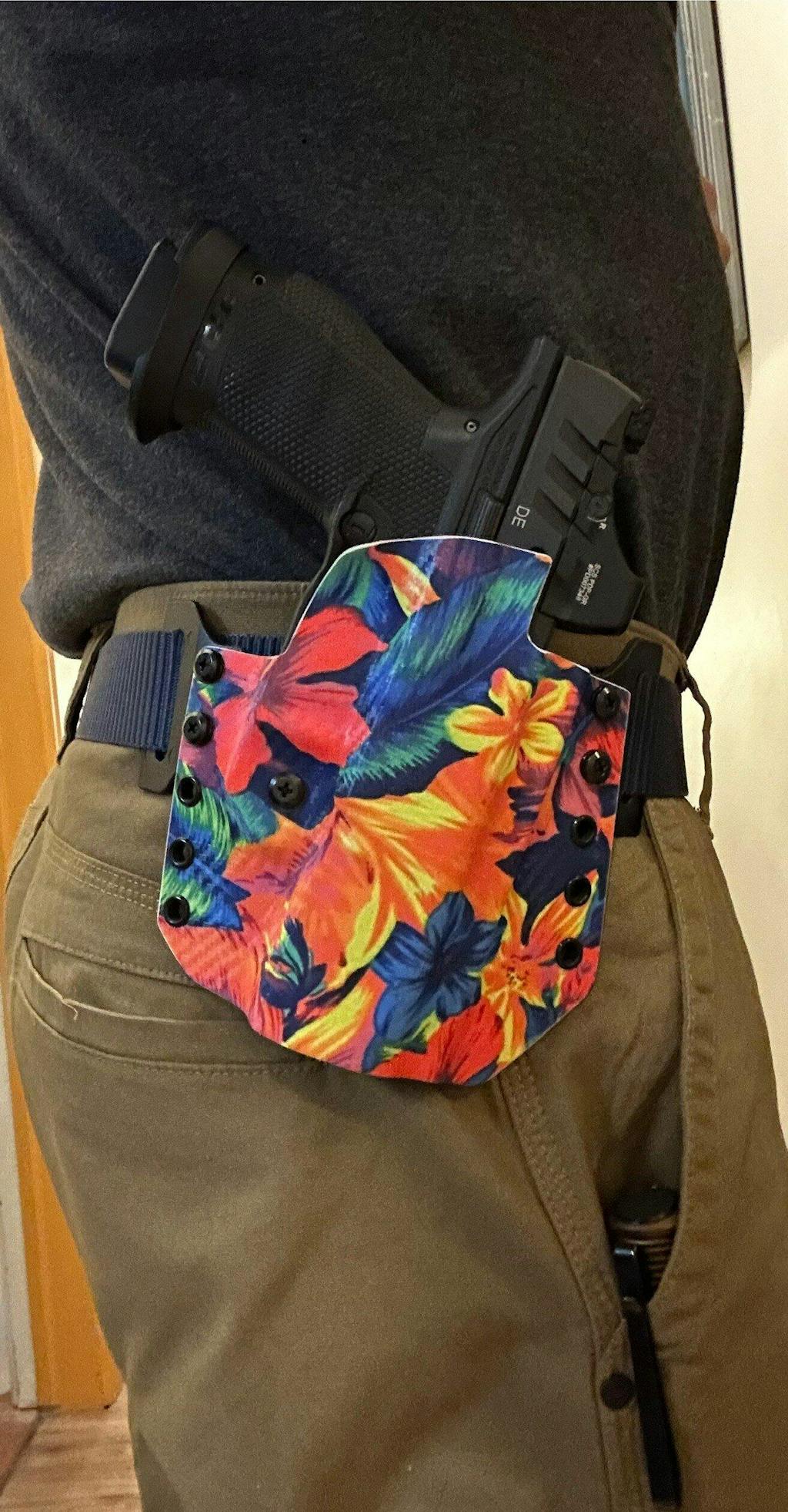 Unlike many other companies out there, we won't add cost to your holsters when selecting a different color, belt clip style, or optic cut. We believe in up-front pricing; the price you see is the price it will cost. (though we do highly recommend our Hawaiian prints on this holster, we do offer them in any of our other color options as well)
